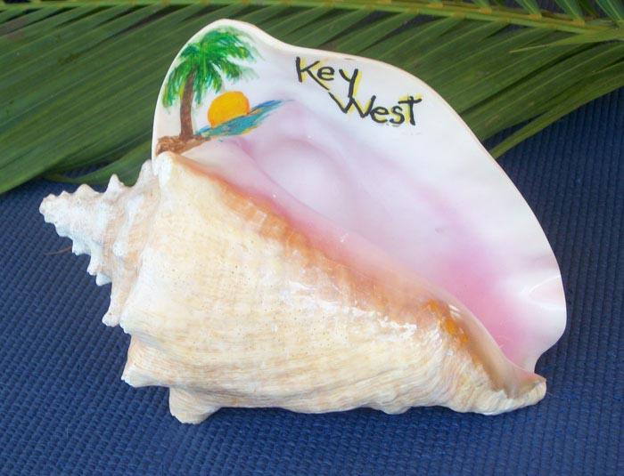 Key West artist Janis Stevens paints tropical scenes on Conch shells. Your name or inscription will appear on the shell.